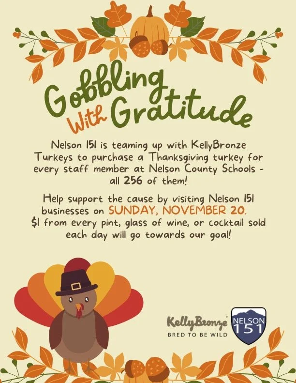 Gobbling with Gratitude Sunday, November 20, 2022 10:30 AM 5:30 PM Valley Road Vineyards 9264 Critzer Shop Road Afton, VA, 22920 United States (map) Google Calendar ICS Support our Nelson County School System staff! $1 of each glass purchased will go towards purchasing a Thanksgiving turkey for each Nelson County Schools staff member. This event is held in conjunction with the Nelson 151 and KellyBronze Turkeys.